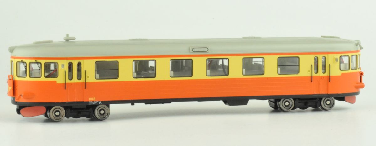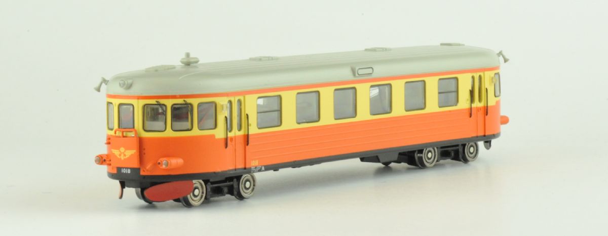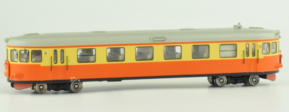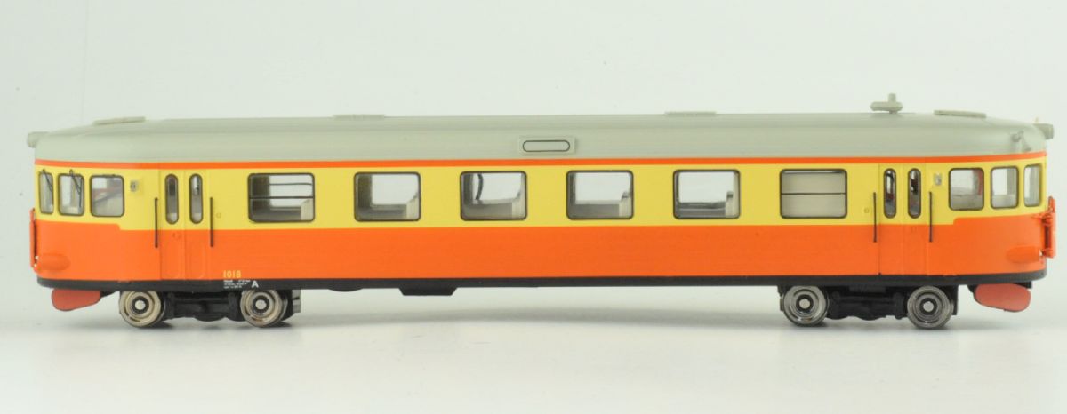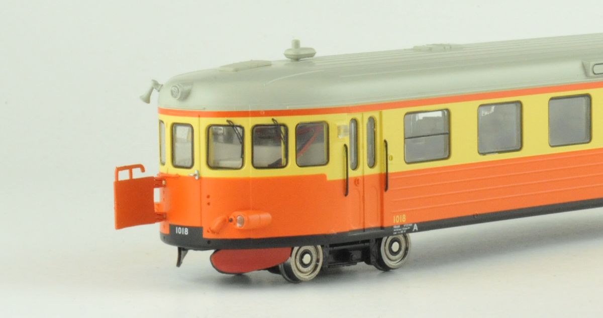 Modell av SJ rälsbuss Y6 med plastkåpa, infällda fönster och LED belysning.